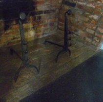 1 pair wrought iron fire dogs, found bricked up in the chimney of the Cutter Tufts - Russell Tavern, Mass Ave Demolished 1907 Andirons 11" tall, 3 hooks for split Record book 1A P18 JRH Inventory P2